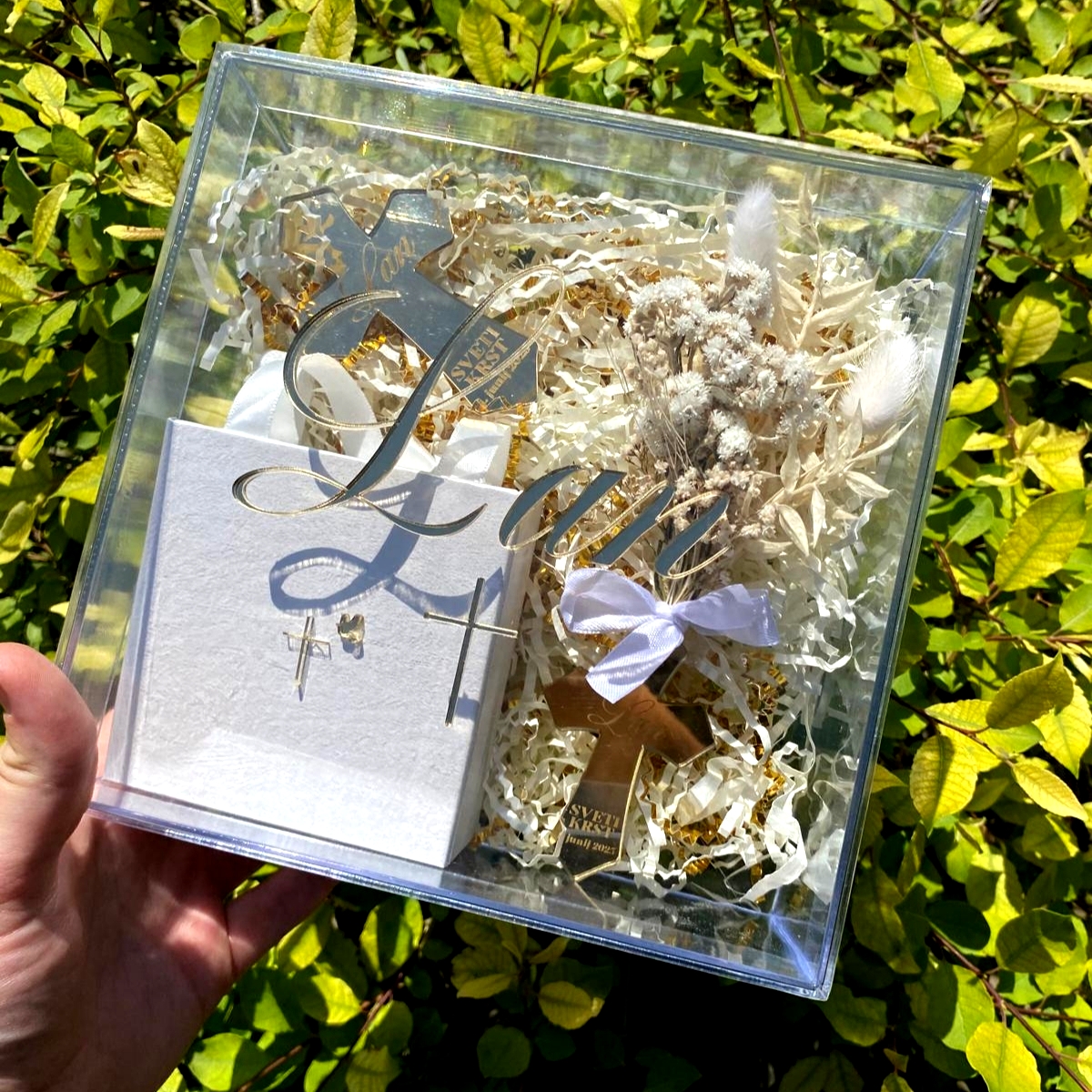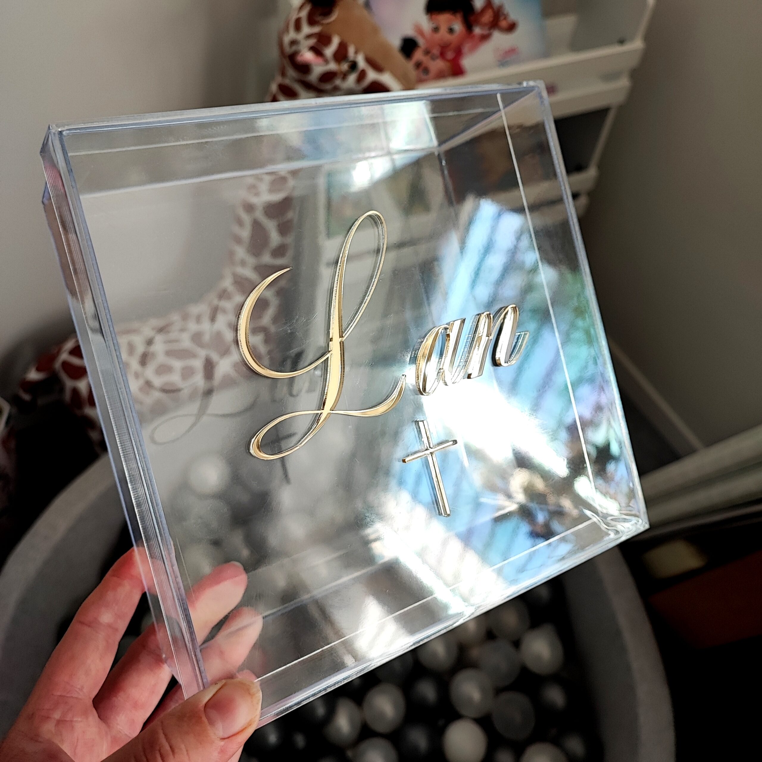 Akrilna prozorna škatla s poljubnim napisom iz akrilnega stekla kot škatla spominov ali kot darilna škatla ob različnih priložnostih – ROJSTVO, KRST, ROJSTNI DAN, POROKA, …